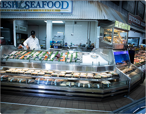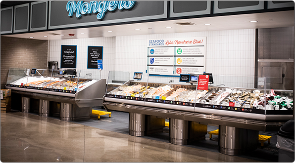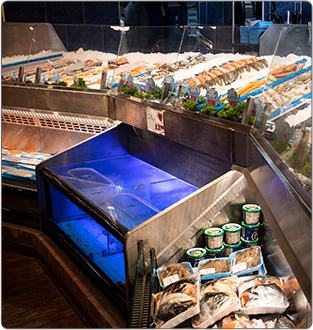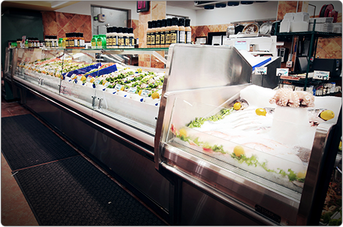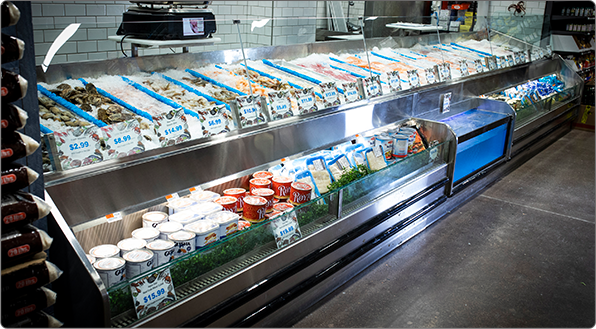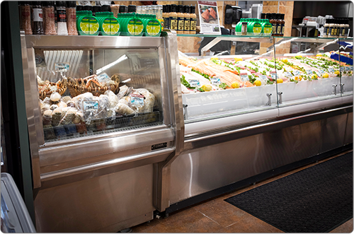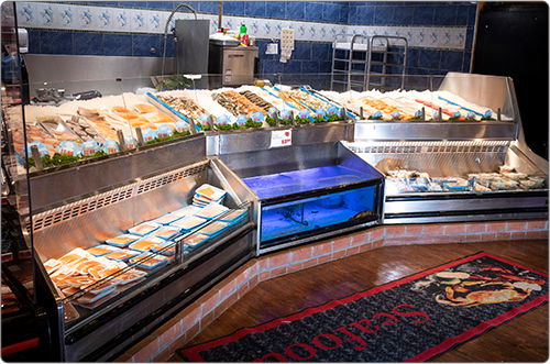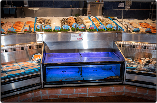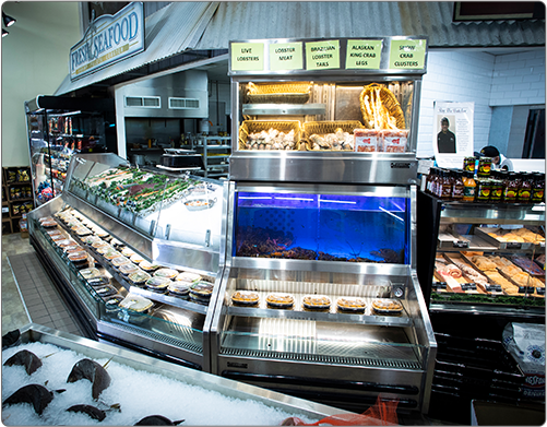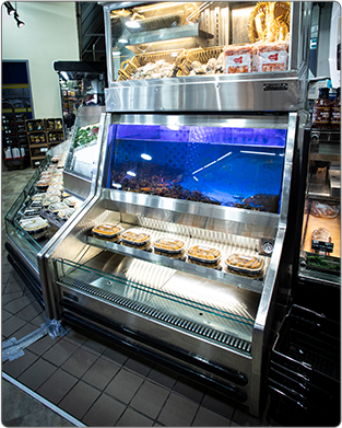 Food Emporium, Howard Beach, Queens • Custom Open Case, Refrigerated Front Merchandiser, In-Line Lobster Tank with Refrigerated Front Merchandiser, Custom Freezer mounted above the Lobster Tank
